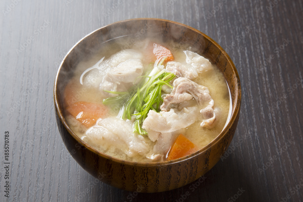 Pork miso soup is a winter staple dish loved nationwide as an ingredient-rich miso soup. Pork umami is combined with daikon radish, carrots, taro, konjac, green onions, etc., simmered in broth and finished with miso. The fragrant miso, vegetable sweetness, and pork richness unite to warm you from the core on cold days.
