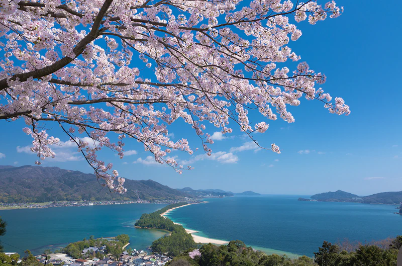 Amanohashidate, located in Miyazu Bay in northern Kyoto Prefecture, is a Special Place of Scenic Beauty featuring a sandbar approximately 3.6km long and 20-170m wide, covered with over 5,000 pine trees. Named for its appearance like a bridge spanning the heavens, it has been celebrated in songs and poems since ancient times.