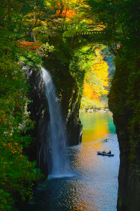 Takachiho Gorge in Takachiho Town in northern Miyazaki Prefecture is a gorge formed when lava that flowed from Mount Aso's eruption cooled and solidified. The representative landscape, "Manai Falls," is known as an impressive waterfall with a 17-meter drop. Walking paths are maintained along the gorge where you can enjoy the valley's beauty and nature throughout the four seasons, and the experience of viewing the falls up close from rental boats is also popular.