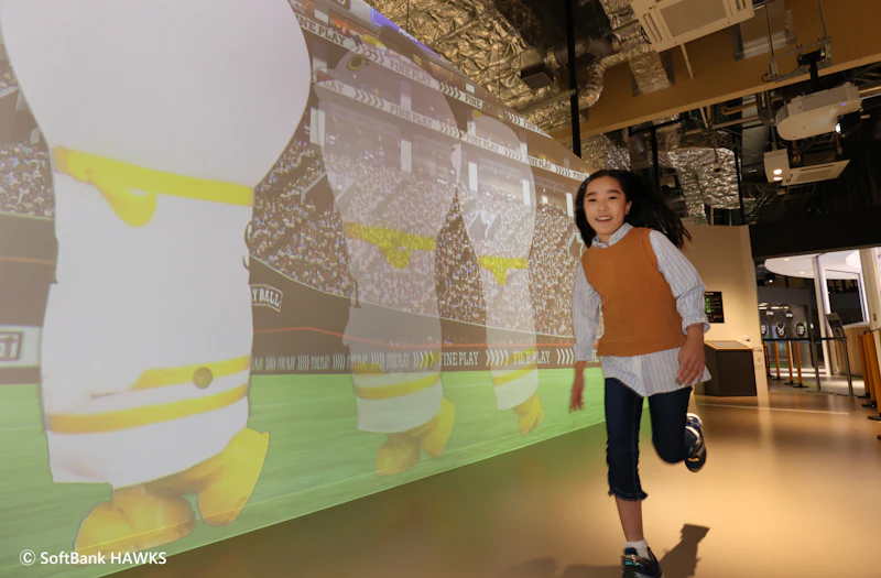 호크스DASH는 호크스 선수나 캐릭터의 영상과 함께 달리기 경주를 하며 누가 더 빠른지 겨루는 어트랙션입니다. 선수나 캐릭터와 나란히 전력질주할 수 있어, 선수의 대단함을 가까이서 실감할 수 있는 기회라고도 할 수 있겠습니다.