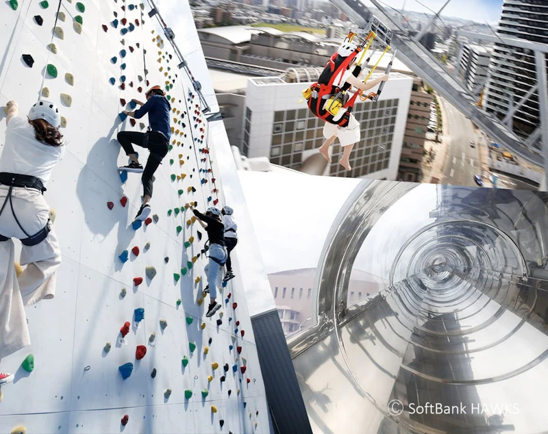 후쿠오카 소프트뱅크 호크스의 경기가 열리는 '미즈호 PayPay 돔 후쿠오카'와 인접한 후쿠오카시의 인기 명소 'BOSS E・ZO FUKUOKA'에는 짜릿한 스릴과 탁 트인 전망을 동시에 즐길 수 있는 어트랙션 '절경 3형제 SMBC 닛코증권'이 마련되어 있습니다. 이 시설은 건물 외벽을 따라 활강하는 슬라이더, 공중을 가르며 질주하는 레일 코스터, 옥상에서 즐기는 클라이밍 등 세 가지 액티비티를 갖추고 있으며, 각각 색다른 스릴과 경관을 제공합니다.