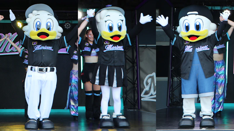 ZOZO 마린 스타디움에 오면 구단 공식 마스코트인 마군(왼쪽), 린짱(가운데), 주짱(오른쪽)도 만날 수 있습니다. 마군, 린짱, 주짱은 야구를 좋아하는 갈매기입니다. '볼파크 스테이지'나 이닝 간 필드에서 M☆Splash!!와 함께 활기차게 퍼포먼스합니다.