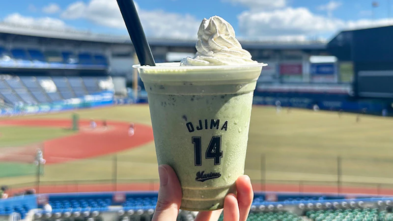 같은 <MARINE KITCHEN FIRST BASE SIDE>에서 살 수 있는 오지마 투수 콜라보의 '오지맛차 프라페'는 크리미한 말차 프라페에 팥이 들어있어 일본식 디저트 같은 맛입니다.