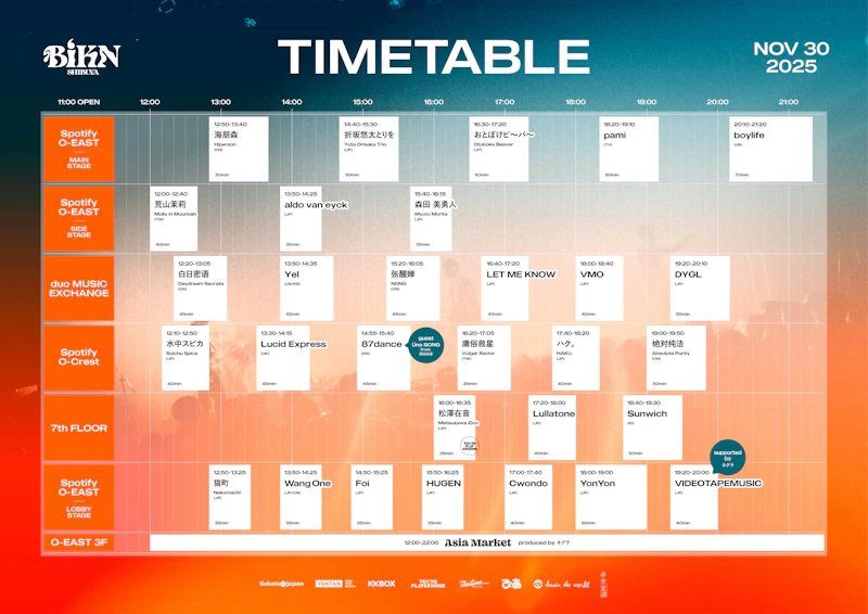 2023年11月3日,在東京・渋谷首次舉辦的「BiKN shibuya 2023」,作為日本發起的展演音樂節獲得極大關注。以Spotify O-EAST為中心,在O-WEST、O-nest、duo MUSIC EXCHANGE、clubasia、7th FLOOR等6個會場採巡迴形式舉行,來自亞洲各國的人氣藝人與日本實力派共計35組演出。首屆即呈現國際色彩豐富且充滿熱情的一天。