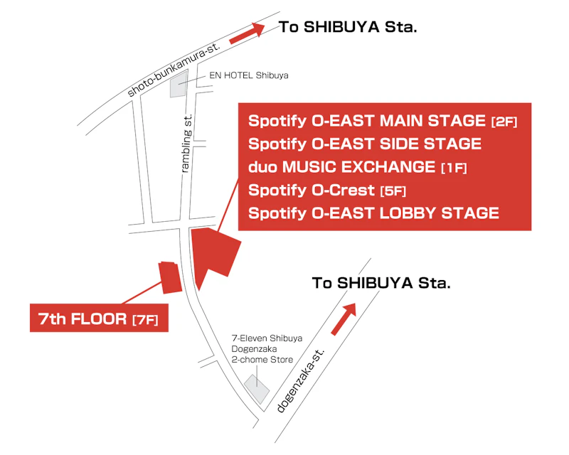 BiKN shibuya 2025的會場為Spotify O-EAST、Spotify O-Crest、duo MUSIC EXCHANGE等3個會場。皆位於渋谷站步行範圍內,交通便利也是其魅力。主會場Spotify O-EAST是配備最新設備的大型Live House,可透過背面LED螢幕進行震撼演出。O-Crest是支撐獨立音樂場景、容量約250人的親密空間,是能遇見新銳藝人的場所。