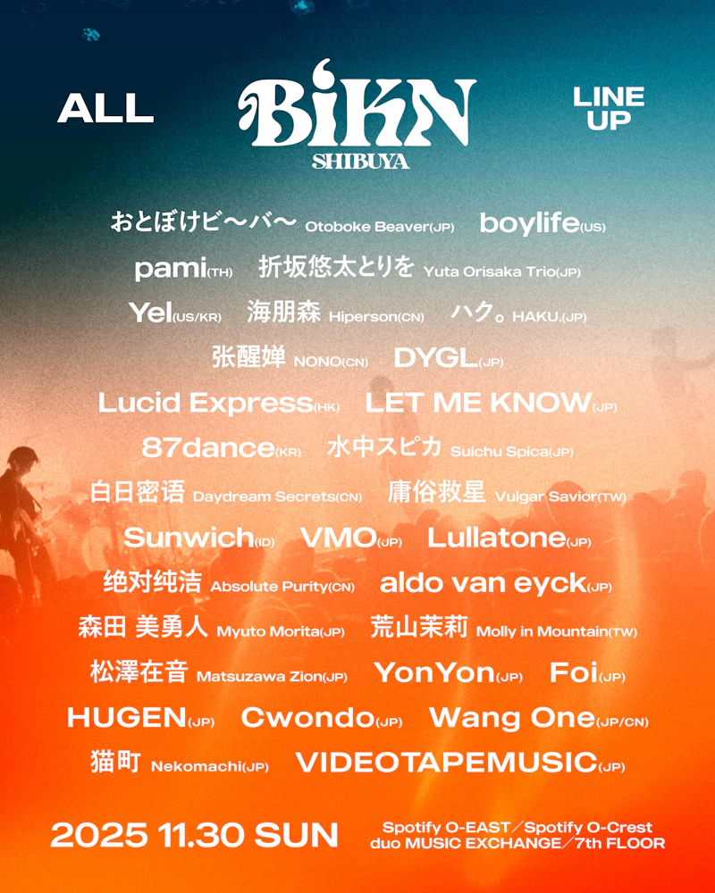 BiKN shibuya作為連結亞洲各國與日本的展演音樂節始於2023年,2024年進一步擴大規模與多樣性。2025年也將以渋谷為舞台,匯聚海外與國內矚目藝人,創造透過音樂跨越國界的交流場所。